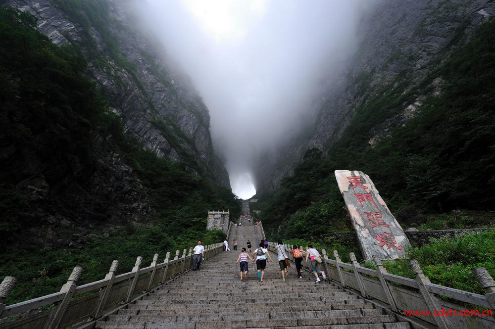 天门山古称嵩梁山,三国时期嵩梁山忽然峭壁洞开,玄朗如门,形成迄今罕见的世界奇观——天门洞,吴帝孙休认为这是吉祥的征兆,于是将嵩梁山改名天门山,山下置天门郡,也就是今天的张家界市。