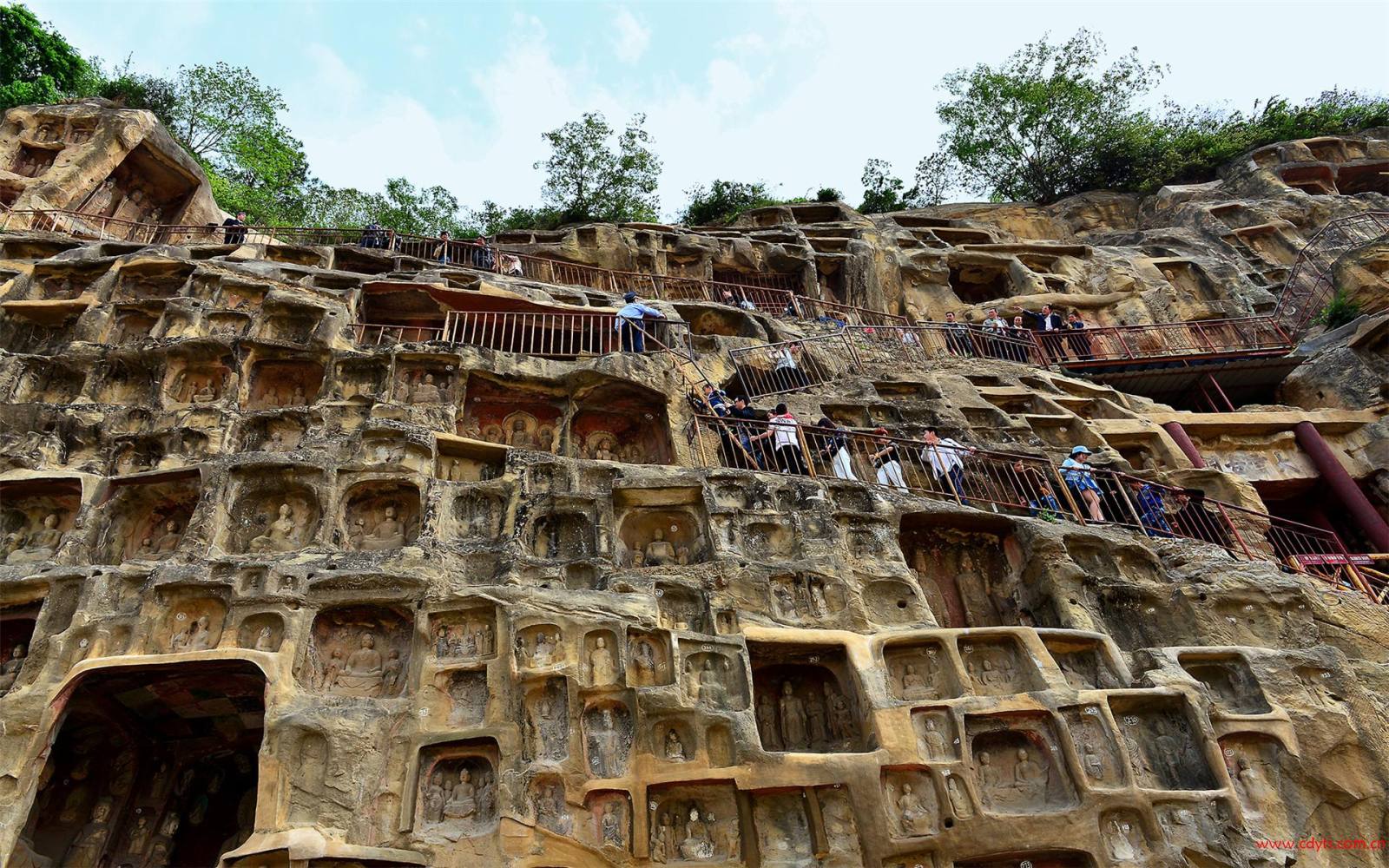 全崖造像以大云洞为中心,分南北两段。南段龛窟有:大佛洞、莲花洞、牟尼阁、千 佛洞、睡佛龛、多宝佛龛、接引佛龛、供养人龛、神龙大佛、如意轮观音、单身佛窟等;北段龛窟有:三世佛龛、无忧花树窟、 弥勒佛龛、三身佛龛、节行僧龛、菩提像窟、伎乐天人窟、地藏 王龛、力士龛、卢舍那佛龛、十一面观音像、阿弥陀佛龛、飞天 窟、清代藏佛洞等。