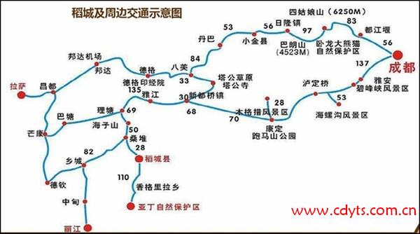 A、成都方向:一是成都经卧龙、丹巴、八美至稻城,八座以下的车可以走;二是成都经雅安、康定至稻城。