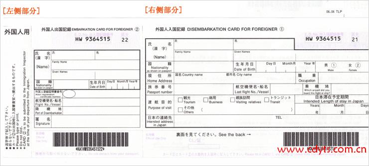 整个卡的左半边,是研修结束后,回国时用的,在日本入境时被撕下订到你的护照上,以后都不要动它,直到回国国时,再次被审查官撕下,补填上日本临时身份证号码、要乘坐的归国航班号码等。整个卡的右半边,入境时被审查官留下。出入境登记卡一定要认真、正确填写。